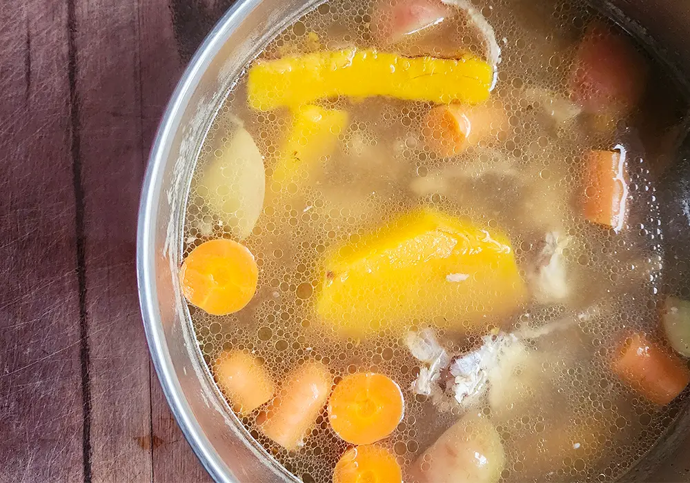 Once done, gently remove the pumpkin, carrot and apple and save them to add to your dog’s meal. Discard the dates. Strain the broth and discard the bones. Let the broth cool before transferring it to the fridge.
