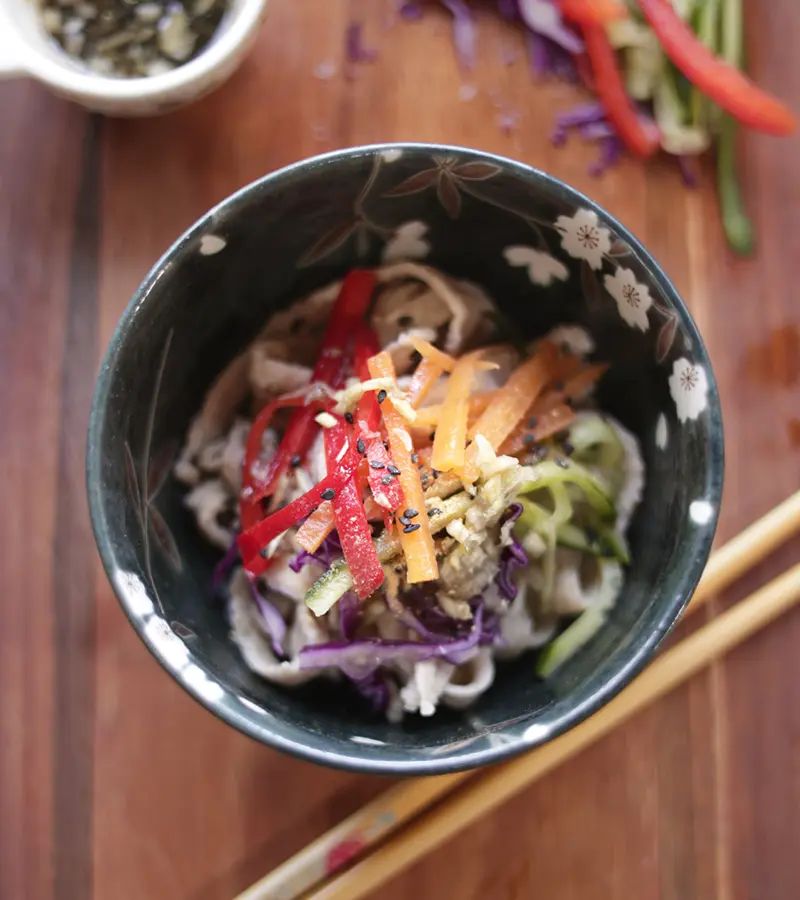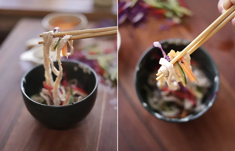 Thinly cut carrots (parboiled), red capsicum, purple cabbage and cucumber, or any vegetables of your choice