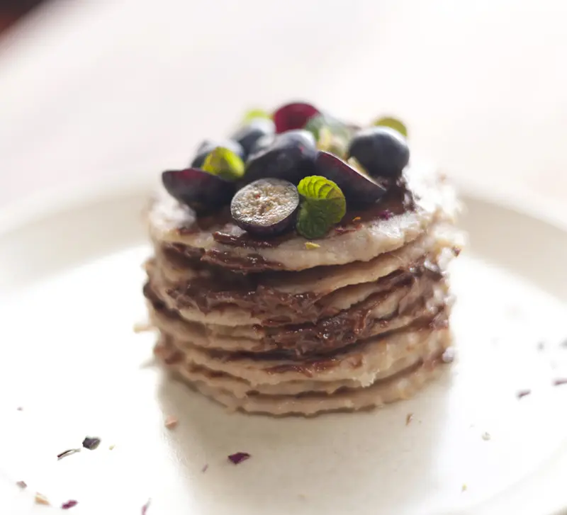 - Layer the cooked pancakes, spreading a little of the creamy carob mousse between each layer.