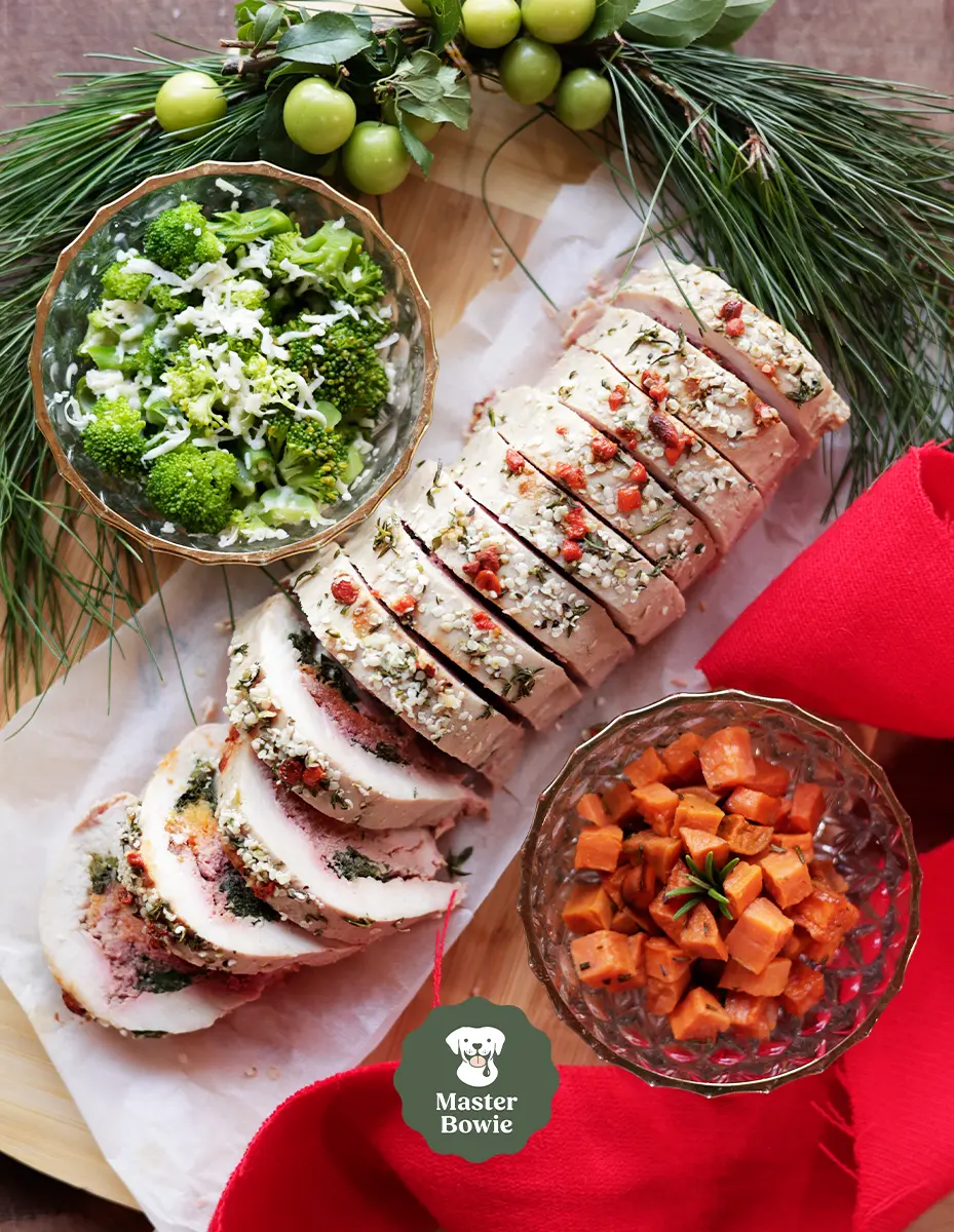 Choose your main protein: Turkey & Salmon or Kangaroo & Salmon. This will be the main protein used throughout your menu. Please note: Livingstone Set ONLY includes Turkey & Salmon Roulade and Turkey Christmas Pudding (NO Eggnog or Mini Cake).